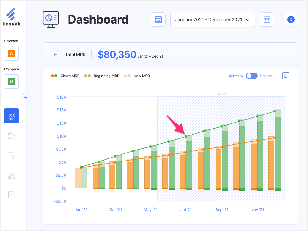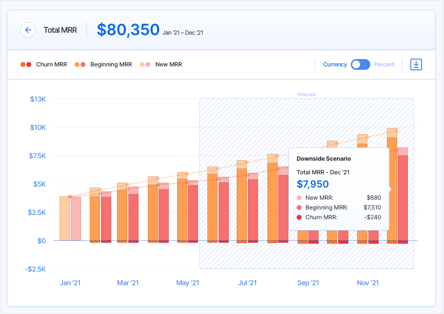 Here, we can see our MRR maxes out below $8K in our Downside scenario by the end of the year.